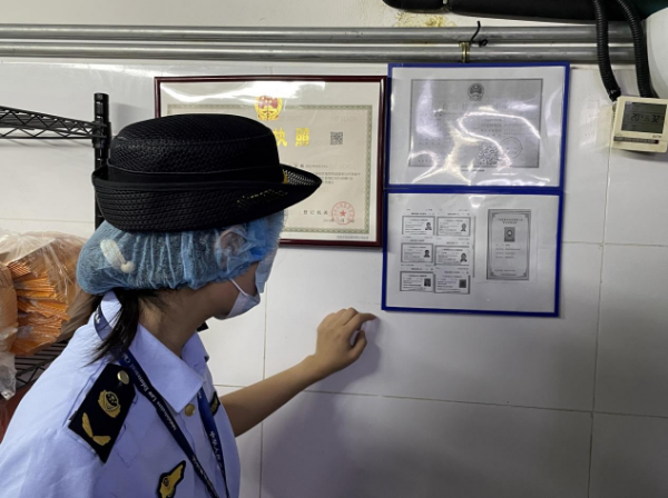 执法人员检查门店公示证照情况