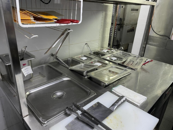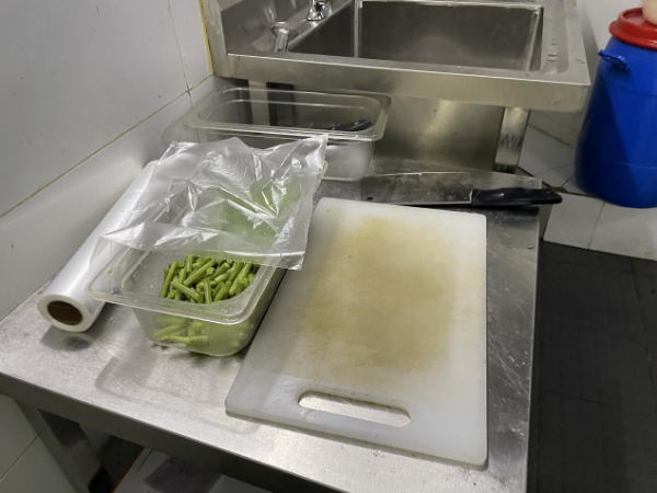 执法人员在进门处的切配区看到摆放的刀具和菜板缺少相关标签标识,导致难以分辨工具的用途,要求工作人员增设颜色标识用以区分刀具。