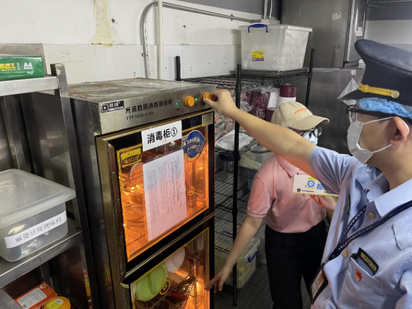 执法人员现场检查餐具消毒柜机运行情况