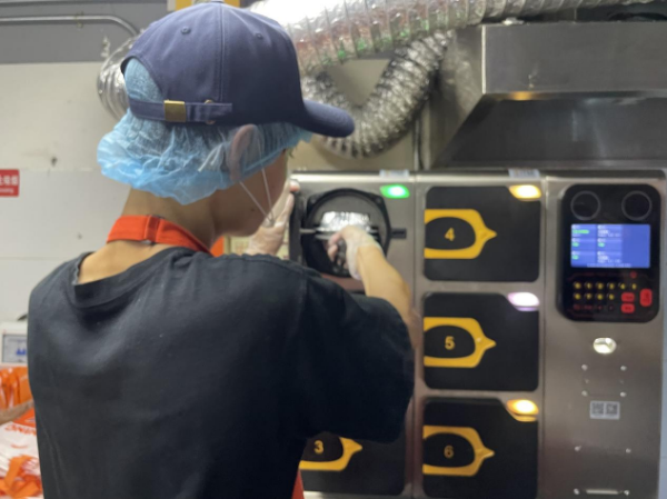 检查期间,店内正好接到一单外卖订单,工作人员现场演示了餐食从加热到出餐的全过程。现场检查看到,工作人员将餐盒从冰箱内取出后放入机器内,经加热炒制3~5分钟后,放入保鲜盒进行包装封口,再由外卖员取走送出。