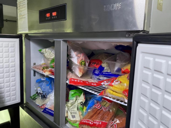 半成品冰箱的冷藏、冷冻温度均符合要求,抽查食材均在保质期范围内。工作人员表示三天左右会进行除霜,但执法人员发现冰箱内冰霜明显较厚,要求提高除霜频率。在冰箱旁的冰柜内,执法人员也同样发现了厚重的冰霜层。执法人员表示,冰霜会影响冰箱的制冷效果,要求后厨工作人员今天内完成除霜工作。